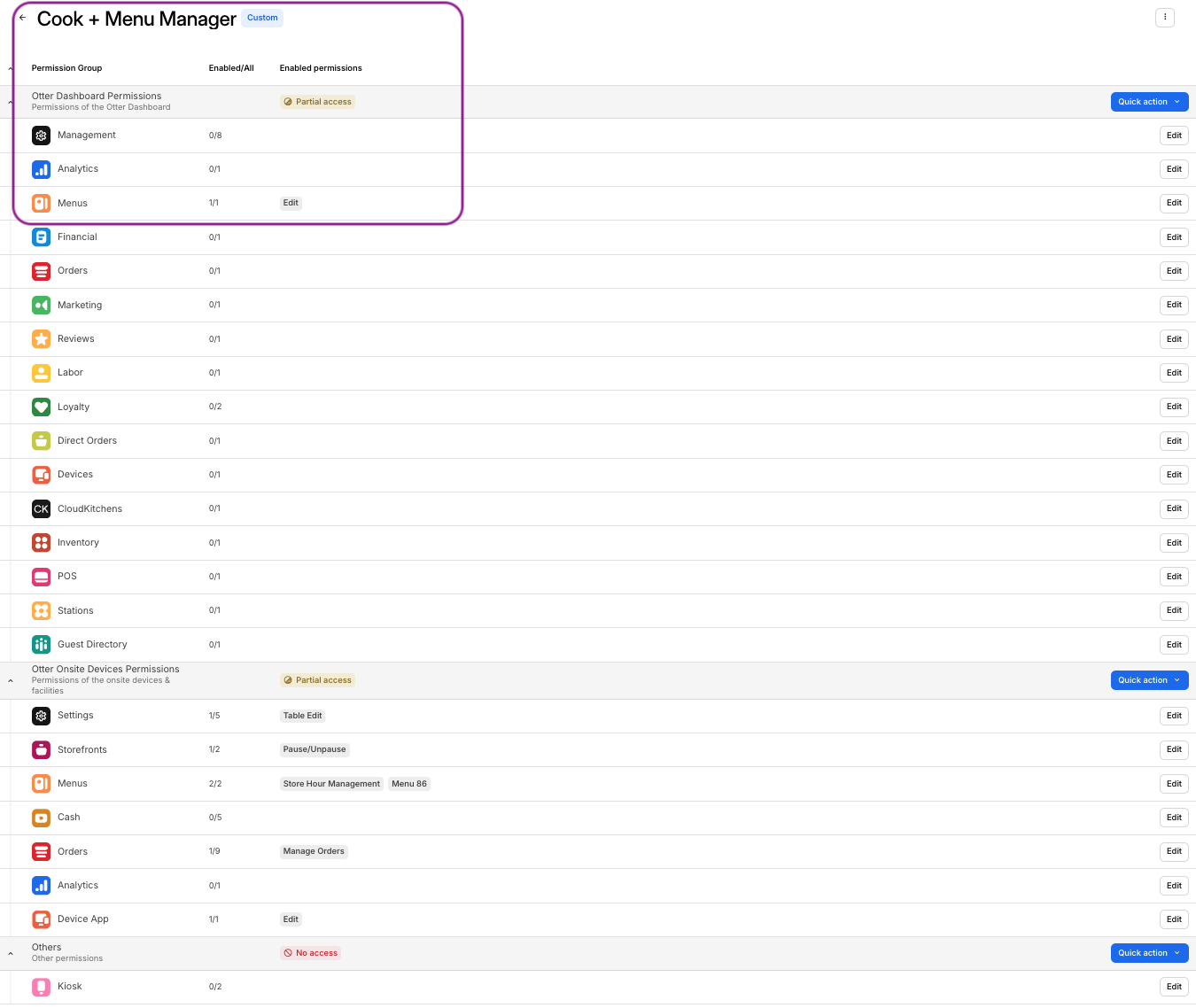 Si deseas agregar acceso completo a todas las aplicaciones dentro del Panel de Otter, puedes hacer clic en Acción Rápida para habilitar todas las aplicaciones en el Panel de Otter para un rol personalizado con un solo clic.6 En la ventana de Editar para una aplicación dada, verás una lista de características elegibles en cada aplicación.