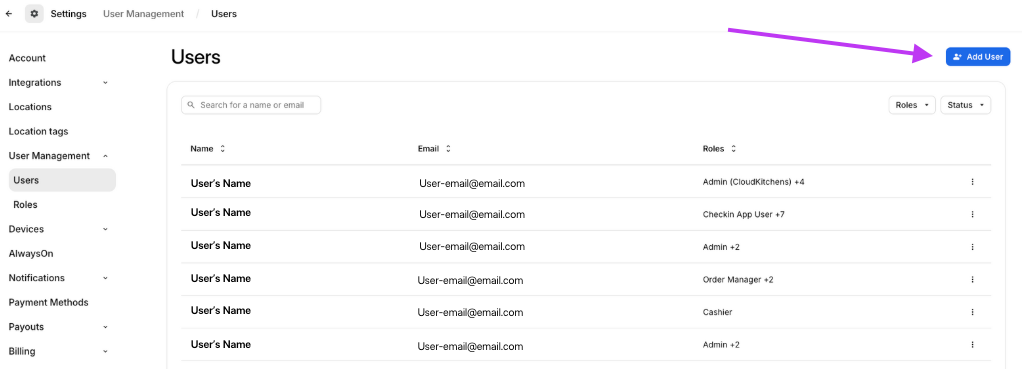 Puedes asignar roles predeterminados o crear roles personalizados (permisos) para cada usuario para limitar o expandir su acceso a la cuenta, así como asignar acceso específico a ubicaciones y marcas.