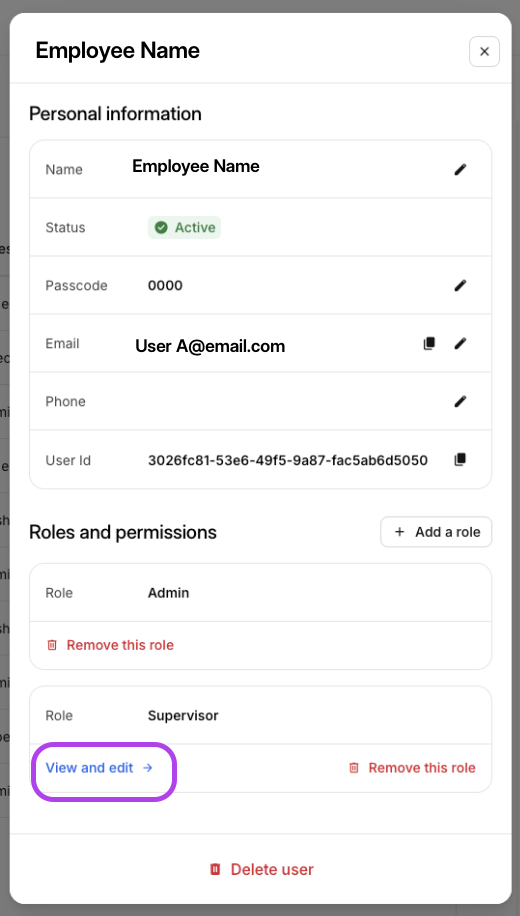 4 Haz clic en [Eliminar este rol] para borrar el rol del usuario seleccionado. 5 Haz clic en [Eliminar rol] para confirmar. 6 La asignación de roles existente se mostrará en la sección de Roles y permisos.