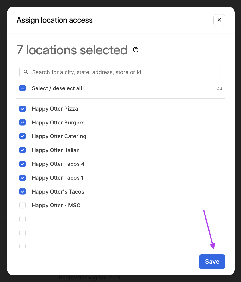 7 Asigna el acceso a la marca al usuario. Puedes seleccionar una o más ubicaciones.