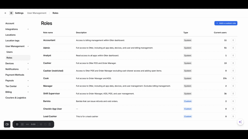 Los Supervisores de Turno son similares a los cajeros, pero también se les da acceso para aprobar ciertas tareas, como abrir una caja registradora o aplicar descuentos. Este rol también proporciona acceso al Panel de Otter.