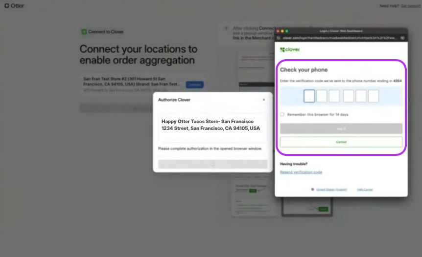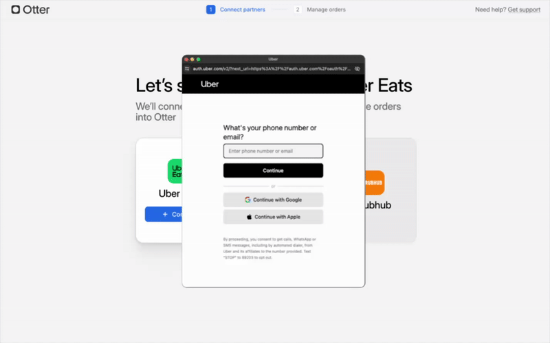 Sigue las indicaciones para seleccionar la marca, ubicación y conectar tu cuenta de Uber Eats a Otter.