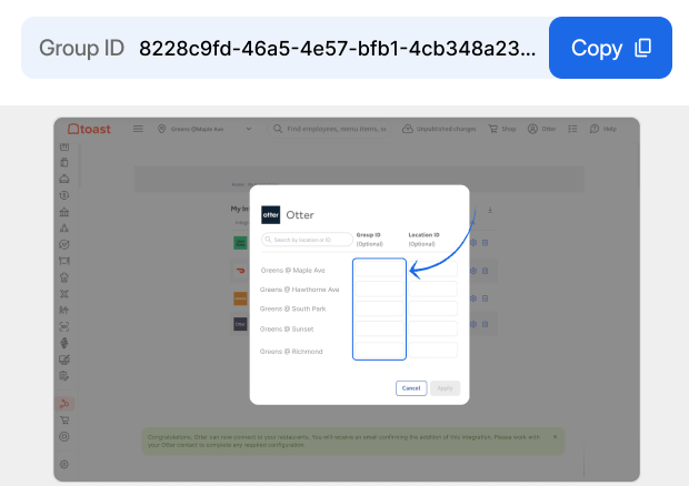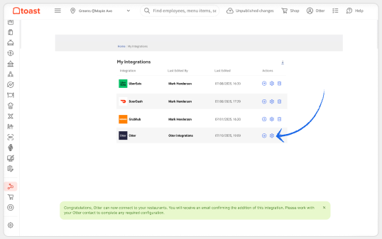 6 Haz clic en el icono de engranaje junto a Otter en Mis Integraciones. 7 Copia y pega el ID de Grupo proporcionado (ubicado en el paso 6 de la ventana de Otter) para cada ubicación en Toast.