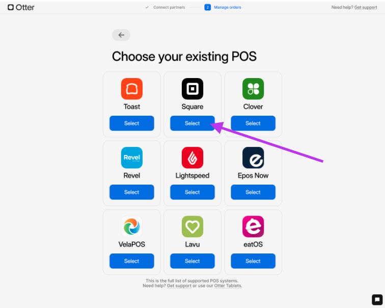 Si seleccionas un sistema POS que no sea Toast, Clover y Square, un compañero de Otter se pondrá en contacto para ayudar a completar la conexión de tu POS a Otter.Botón de comenzar para redirigir