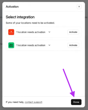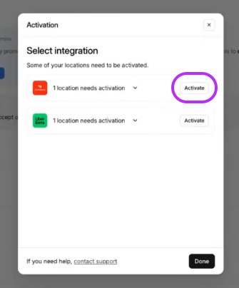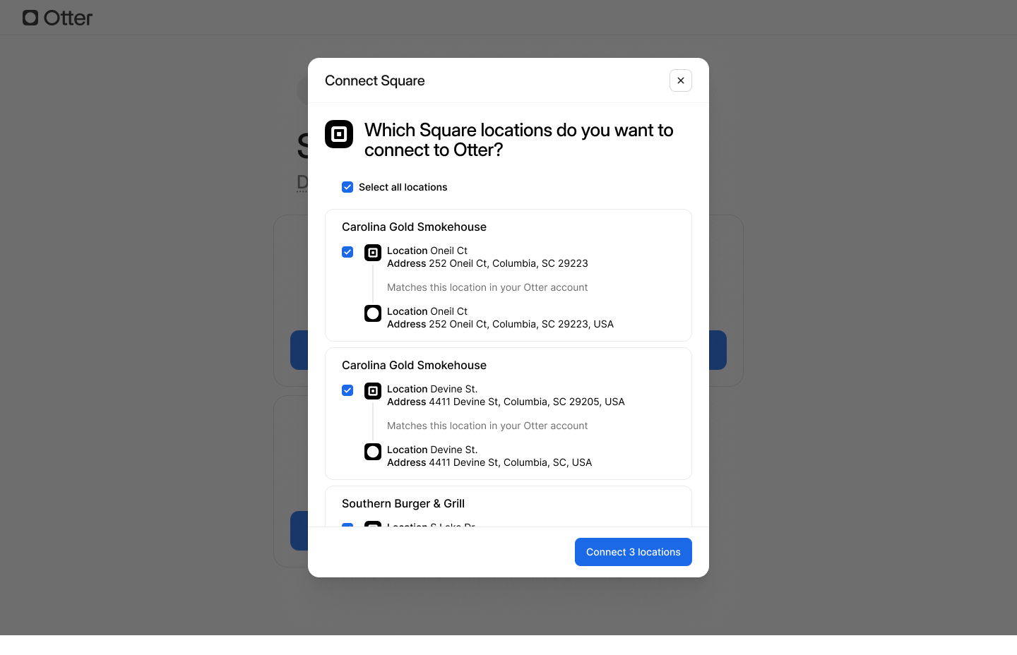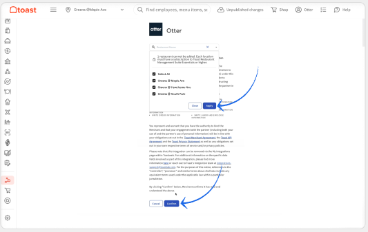 Si la aplicación Otter requiere una suscripción, primero debes configurar Restaurant Suite.Selecciona ubicaciones y haz clic en [Confirmar].