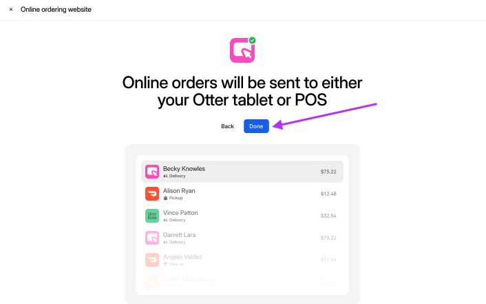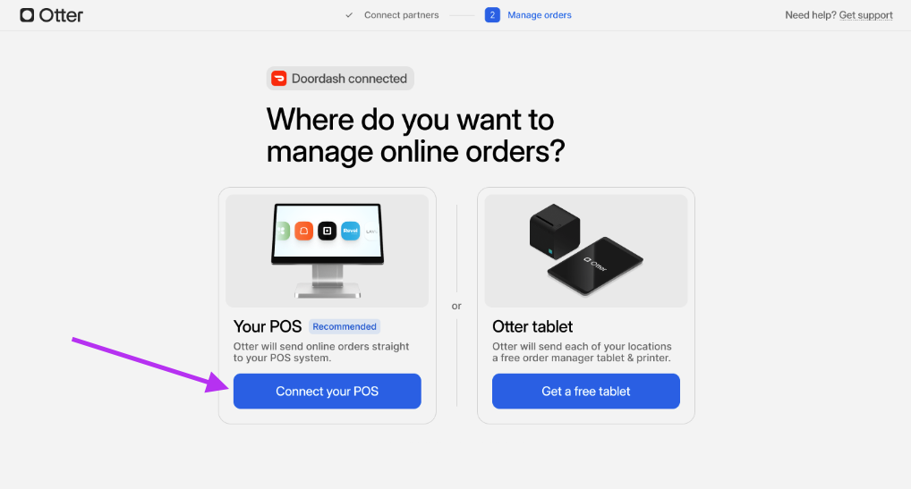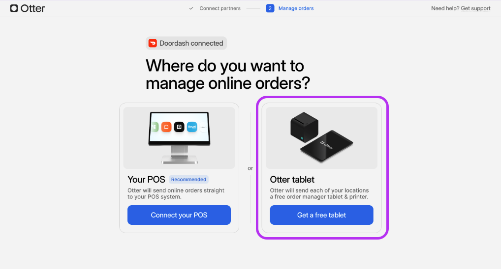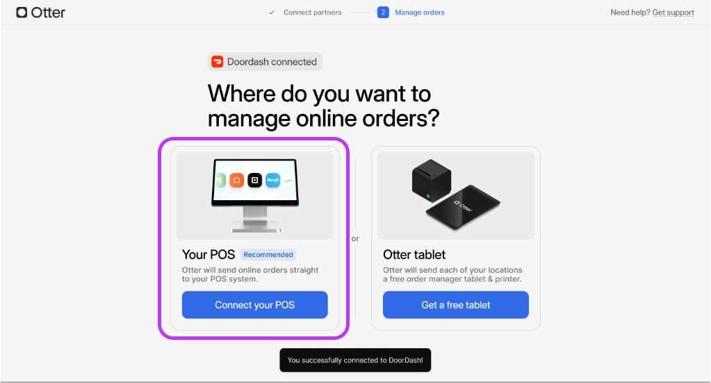 Después de conectar exitosamente Uber Eats y DoorDash, elige si gestionarás los pedidos en línea a través de tu POS o una tableta de Otter.