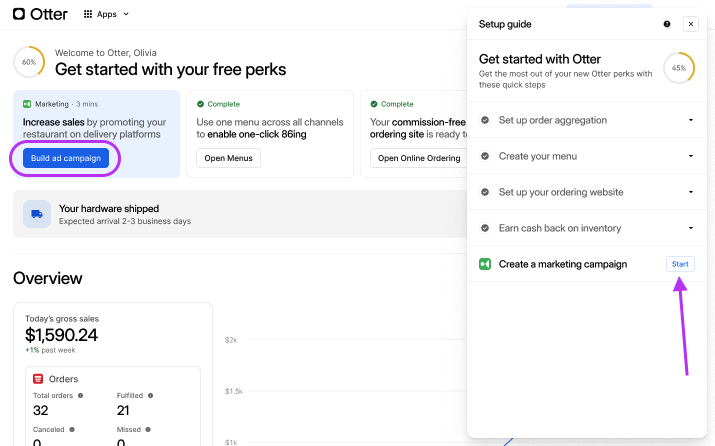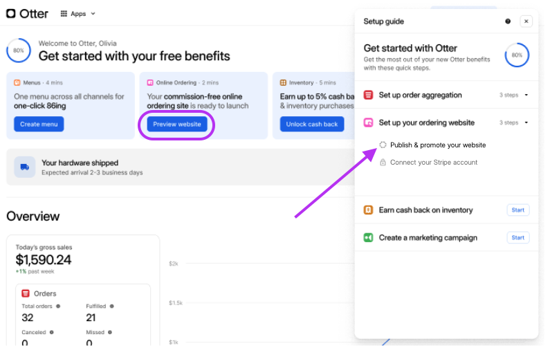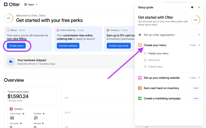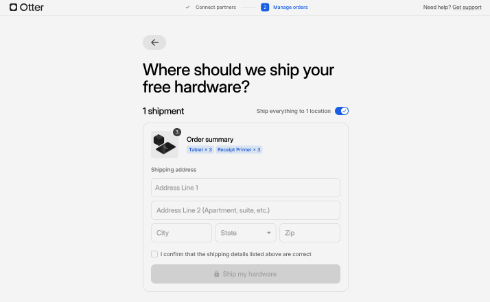 Después de seleccionar gestionar pedidos en línea a través de la tableta Otter, necesitarás pedir el hardware. Sigue los pasos a continuación para obtener una tableta Otter.
