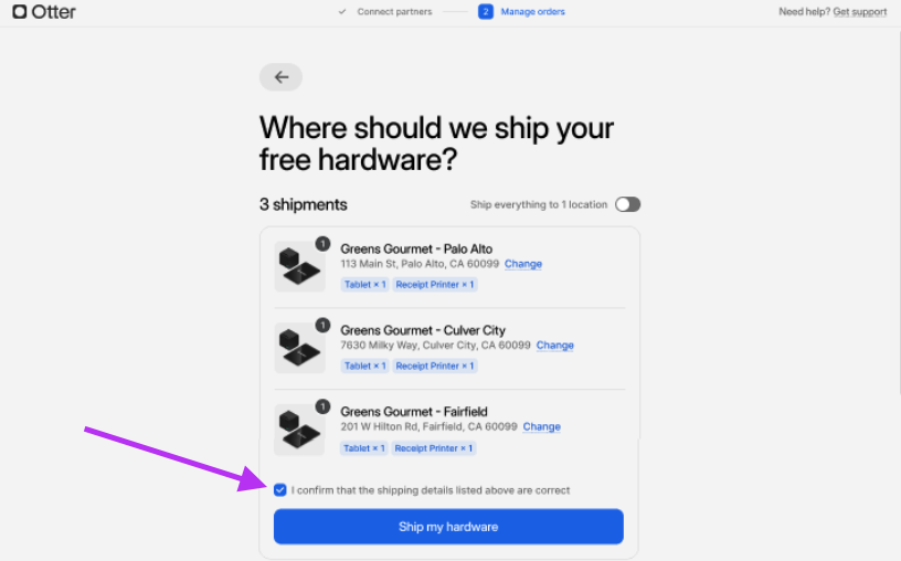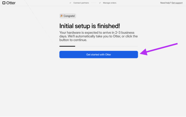 3 Se mostrará una confirmación con el tiempo estimado de llegada del hardware. 4 Haz clic en [Comenzar con Otter] para ser redirigido al Panel de Otter y completar las tareas de incorporación dentro de Otter.