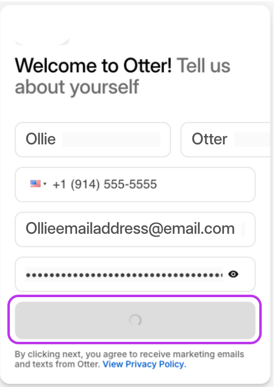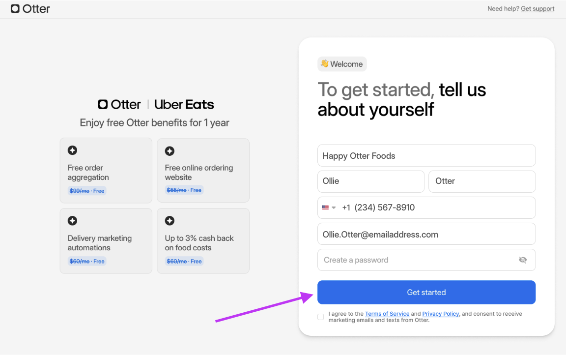 Si estás atascado o necesitas ayuda en cualquier momento durante el proceso de incorporación, comunícate con el equipo de Otter haciendo clic en Obtener soporte durante el registro inicial, o en la burbuja de chat dentro del Panel de Otter.