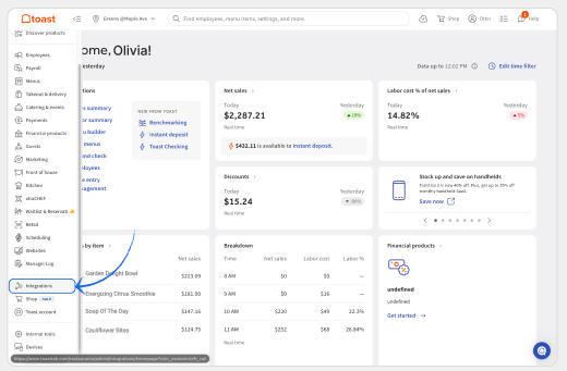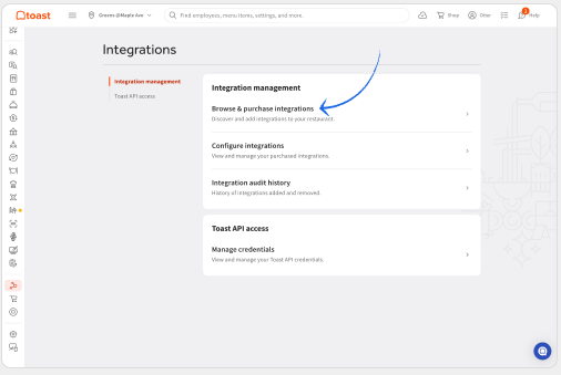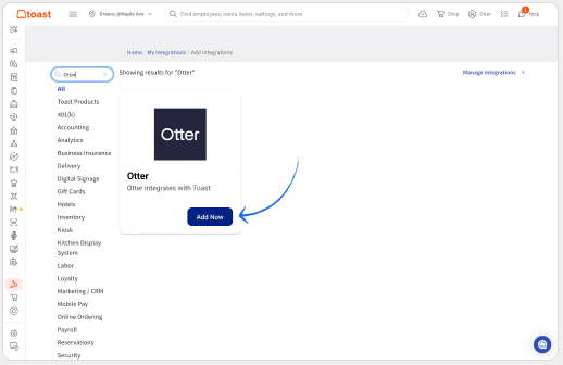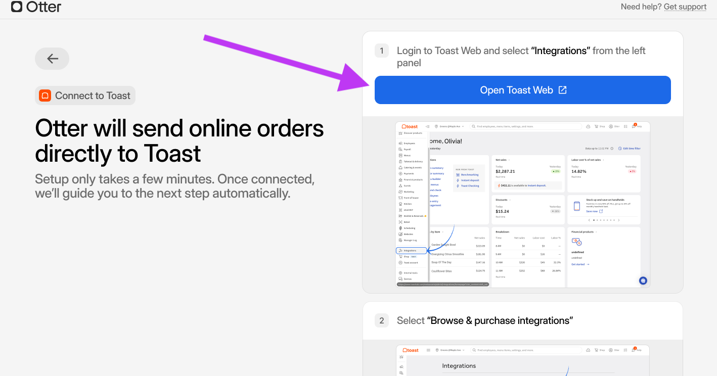 Toast requiere algunas acciones dentro de su portal web para conectarse a Otter. Hay una guía de referencia de pasos dentro de la ventana de Otter para ayudarte con las acciones necesarias.4 Inicia sesión en Toast Web y ve a la pestaña de Integraciones.