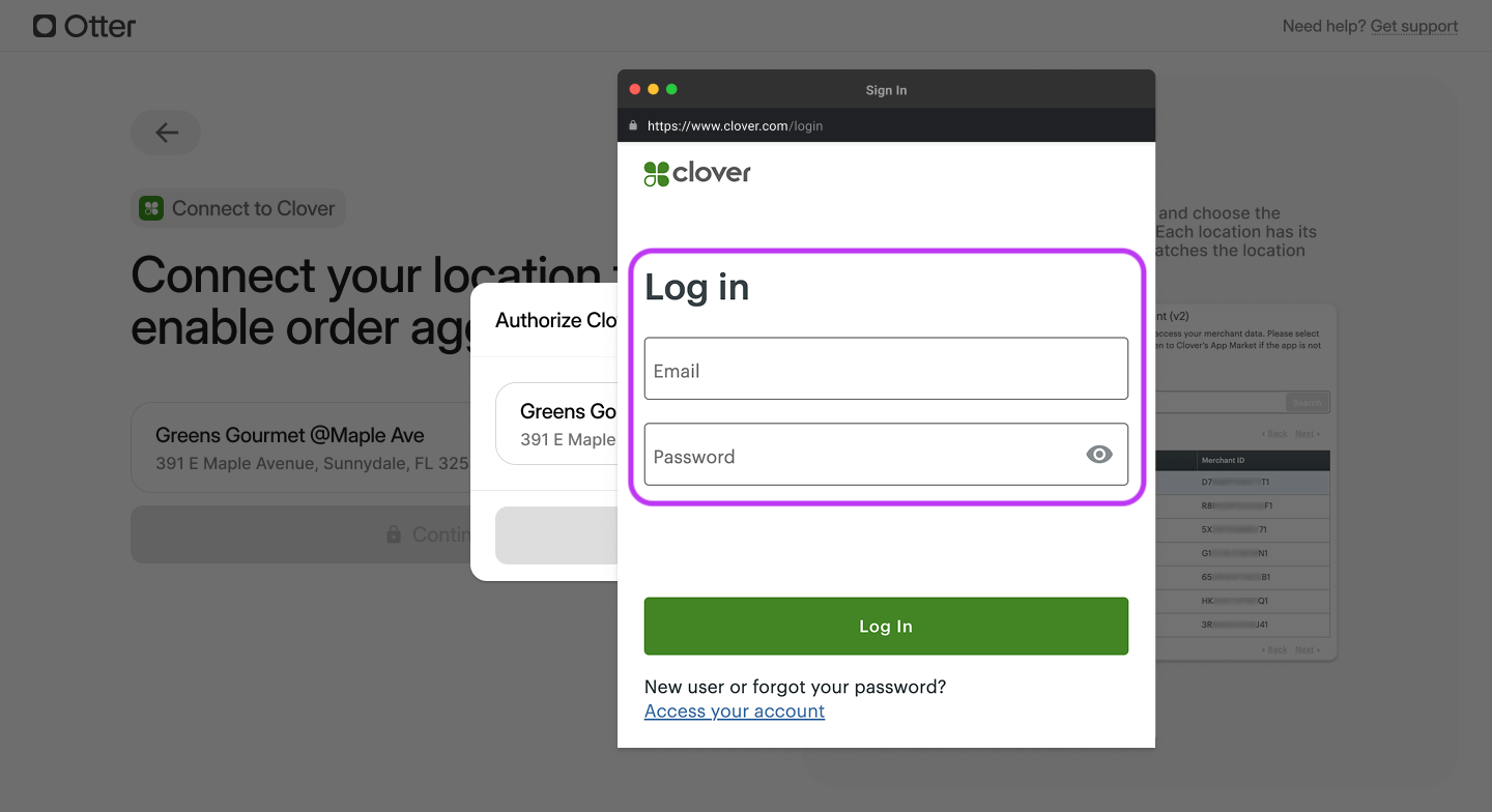 4 Usa tus credenciales de Clover para iniciar sesión en Clover desde la ventana emergente.