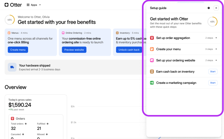 Una vez que hayas conectado tu sistema POS o pedido tu tableta Otter, serás redirigido al Panel de Otter para completar tu incorporación al Panel de Otter.