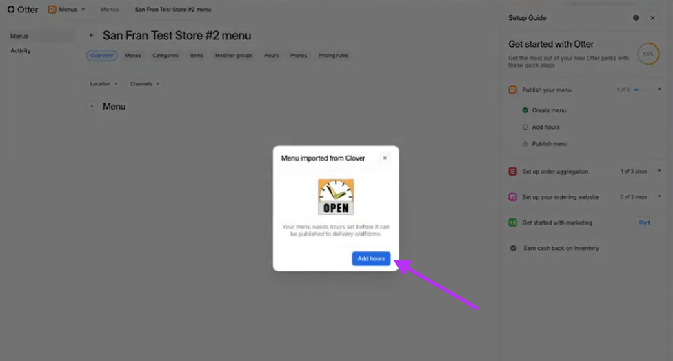 Paso Proceso Imagen 1 Haz clic en [Crear menú] desde la Guía de Configuración o la parte superior de la página del Panel de Otter. 2 El menú vinculado al sistema POS conectado (si corresponde) o a la(s) plataforma(s) de entrega se importará automáticamente. 3 Se mostrará una confirmación de importación y se te pedirá que agregues los horarios del menú.