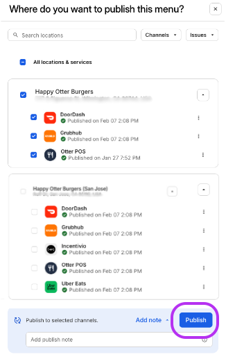 8 Selecciona todas las ubicaciones y canales para publicar el menú.