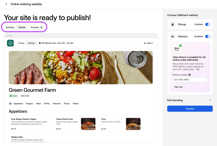 La vista previa mostrada en el lado derecho es una vista previa real de tu sitio web de pedidos. Puedes desplazarte dentro de la vista previa del teléfono para ver más de tu menú.3 Se mostrará la confirmación de construcción del sitio de pedidos en línea. 4 Se mostrará una vista previa completa del sitio— puedes cambiar entre la vista de Escritorio o Móvil o hacer clic en [Vista previa] para una vista previa en ventana completa. 5 Alternar para ajustar las opciones de método de cumplimiento listadas en el menú de la derecha. 6 Uber Direct se habilitará como el mensajero para todos los pedidos de entrega en línea de tu sitio en línea.