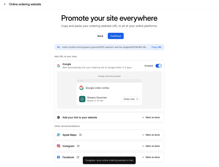 Usa la URL proporcionada para enlazar tu sitio de pedidos en los sitios recomendados listados.