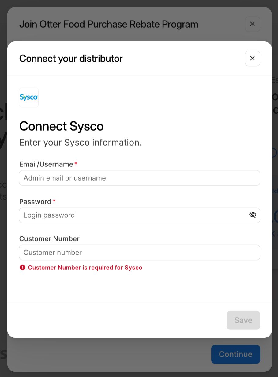 Si actualmente estás en otro programa GPO, no serás elegible para ganar reembolsos a través de Otter.4 Haz clic en [Conectar] junto al distribuidor de alimentos correspondiente que usas/te gustaría usar. 5 Usa las credenciales del distribuidor de alimentos para iniciar sesión y conectarte para Reembolsos. 6 Una vez conectado exitosamente, Conectado se mostrará junto al distribuidor listado.