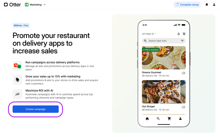 El Marketing de Aplicaciones de Entrega permite a los restaurantes crear, implementar, promover y rastrear campañas para su negocio en plataformas de aplicaciones de entrega.