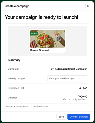 Paso Proceso Imagen 1 Haz clic en [Iniciar] para Crear una campaña de marketing desde la guía de configuración o [Construir campaña publicitaria] desde la página de inicio del Panel de Otter. 2 Haz clic en [Crear campaña]. 3 Haz clic en [Crear Campaña Inteligente] o selecciona una campaña de “opción popular” listada para una oferta específica. 4 Introduce el Presupuesto semanal para la campaña.