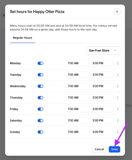 Si tu negocio opera las mismas horas todos los días de la semana, puedes establecer rápidamente la hora para cada día a la vez configurando las horas para un día, luego haciendo clic en los 3 puntos para seleccionar Copiar a todos los días.Obtén más información sobre cómo establecer los horarios del menú aquí.