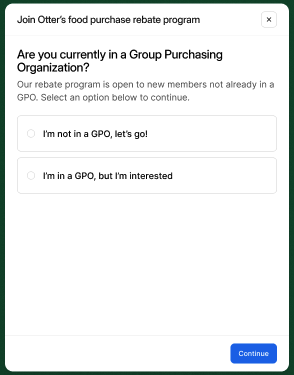 Paso Proceso Imagen 1 Haz clic en [Comenzar] para Ganar reembolsos en inventario desde la guía de configuración o [Desbloquear reembolsos] desde la página de inicio del Panel de Otter. 2 Haz clic en [Comenzar a ganar reembolsos]. 3 Confirma si actualmente estás inscrito en otro programa GPO.