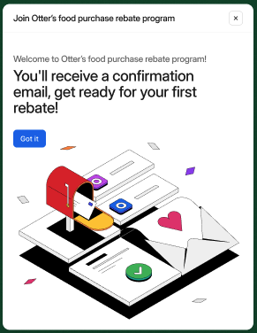 Asegúrate de firmar y hacer clic en siguiente para completar el registro.8 Se mostrará la confirmación para el programa de Reembolsos de Otter.