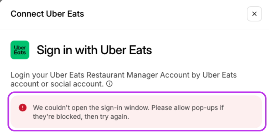 Haz clic en [+ Conectar] para Uber Eats e ingresa tus credenciales de Uber Eats en la ventana emergente.
