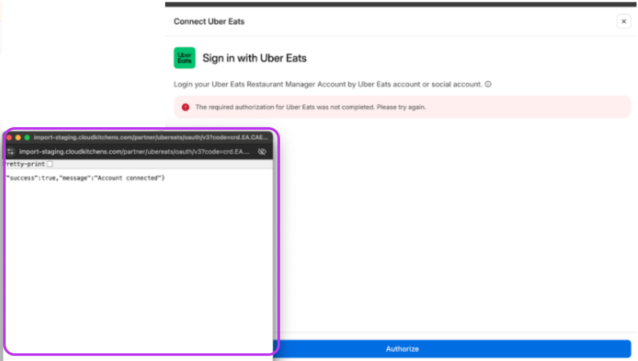 Si después de haber ingresado tus credenciales en la ventana emergente de inicio de sesión, la ventana no se cierra o muestra un error, simplemente cierra la ventana emergente y haz clic en [Autorizar] nuevamente.