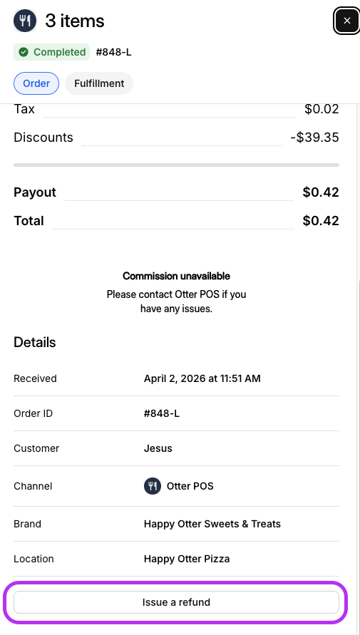 El Panel de Historial de Pedidos se puede ver desde el Panel de Otter. Puedes ver el desglose completo de los detalles del pedido, incluyendo: