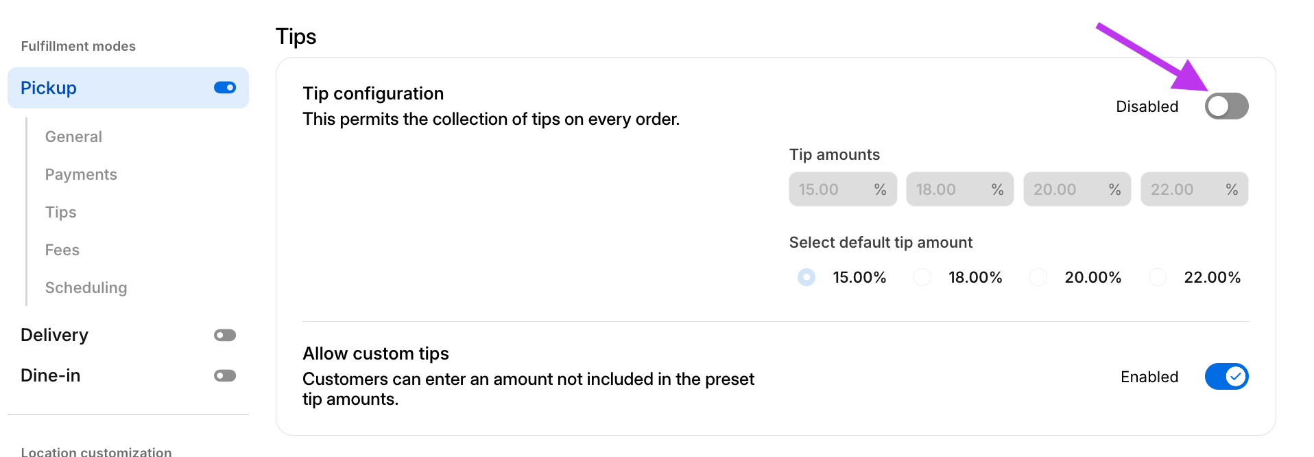 Faites défiler jusqu'à la section Pourboires. Activez le bouton à côté de Collecter les pourboires.