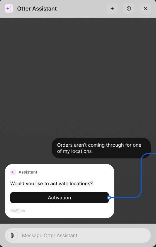 Si un message d'erreur apparaît à cette étape indiquant qu'il y a eu un problème, contactez votre gestionnaire de compte Otter assigné pour vous aider avec l'activation de l'intégration.Étape Processus Image 1 Ouvrez Otter Support Chat Bot (Otter Assistant) sur un appareil Otter ou le tableau de bord Otter.