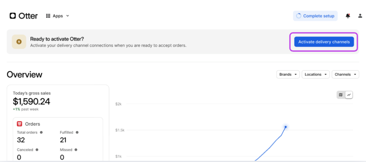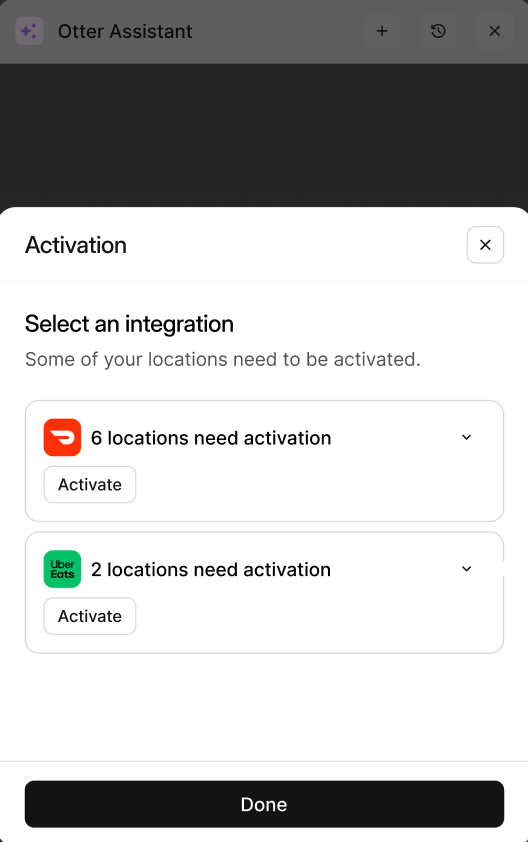 Étape Processus Image 1 Depuis la page d'accueil du tableau de bord Otter, sélectionnez Activer les canaux de livraison 2 Sélectionnez les emplacements pour lesquels vous souhaitez activer l'intégration Uber Eats 3 Cliquez sur [Activer] pour l'intégration Uber Eats.