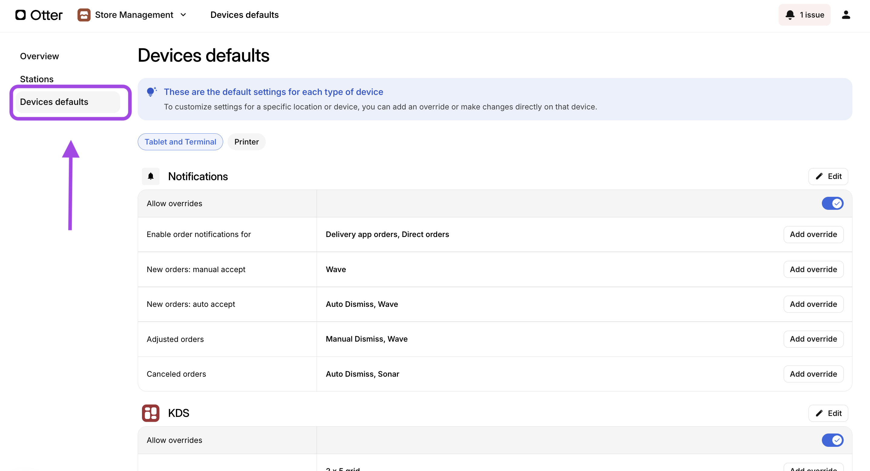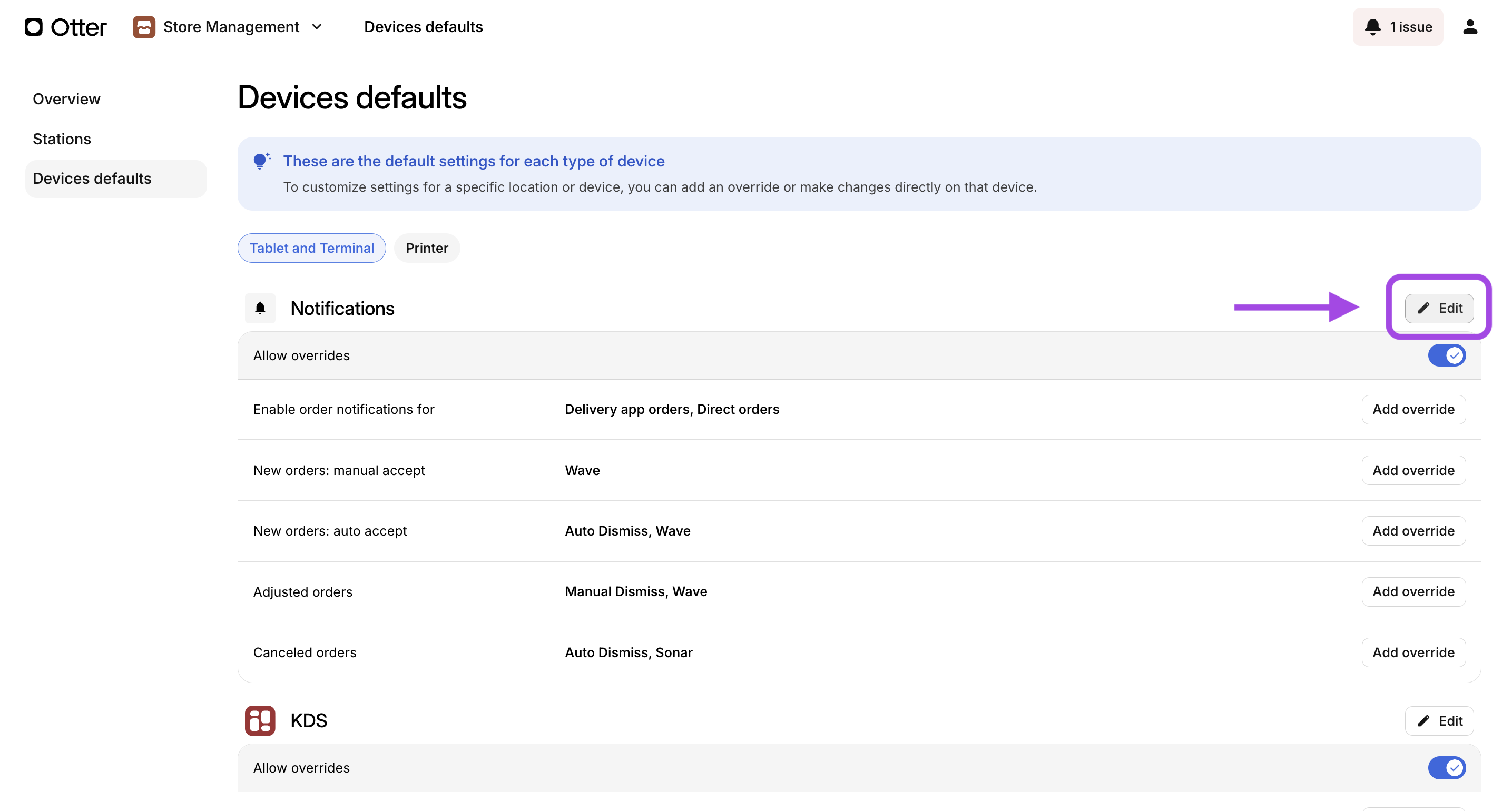 Pour configurer les notifications de commande par défaut pour les organisations ayant plusieurs établissements, rendez-vous dans l’application Gestion de magasin sur le tableau de bord Otter. Cette application facilite l’application des paramètres par défaut en masse et leur application à tous les établissements ou à une sélection d’entre eux.