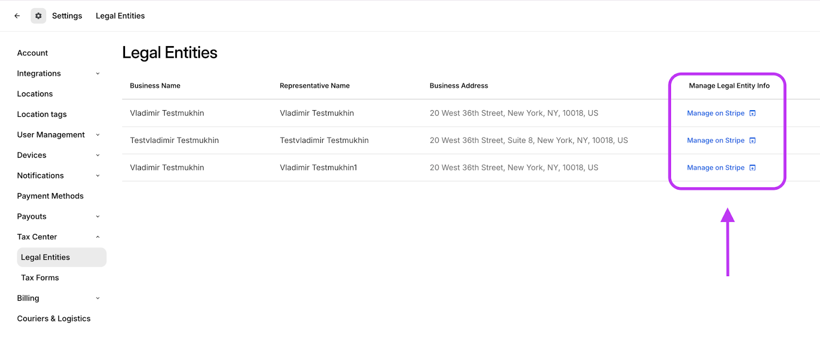 | 6 | Pour mettre à jour les détails de l'entreprise, cliquez sur le lien "Gérer sur Stripe" qui redirigera vers le portail de service Stripe Connect pour les modifications. |