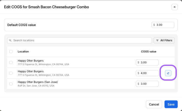 Lors de la saisie du prix pour le Coût des marchandises vendues, vous pouvez définir un prix par défaut ou spécifier des montants différents pour chaque emplacement, puis filtrer la liste pour identifier rapidement les emplacements manquant de valeurs de coût des marchandises vendues.