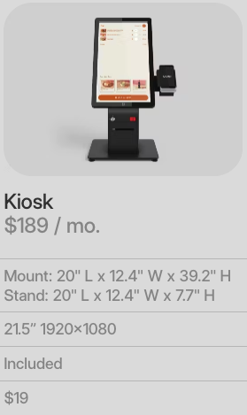 Le Kiosk Mini est un terminal à écran unique dédié uniquement à l'utilisation de kiosque. Il est conçu pour offrir aux clients une expérience de libre-service fluide et est parfait pour les emplacements avec un espace limité ou un volume de clients élevé.