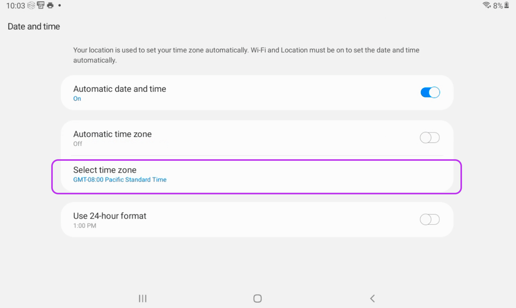 Si vous utilisez une tablette ou un POS Otter, suivez les instructions ci-dessous :Étape Processus Image 1 Depuis l'écran d'accueil de l'appareil, sélectionnez Paramètres. 2 Sélectionnez Gestion générale. 3 Allez à Date et heure. 4 Vérifiez que le fuseau horaire indiqué est correct.