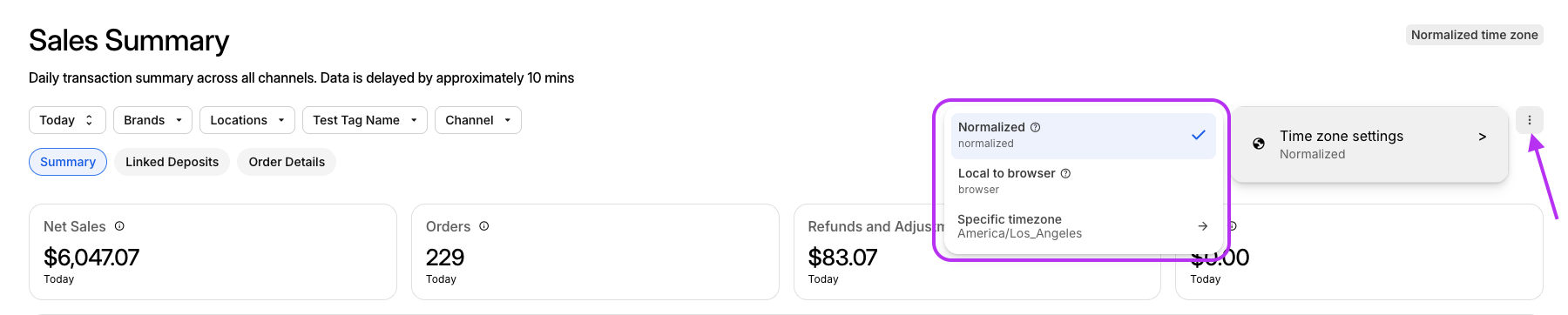 Par défaut, le résumé des ventes s'affichera en heure normalisée, qui est l'horodatage lorsqu'une commande se produit dans l'heure locale du magasin.