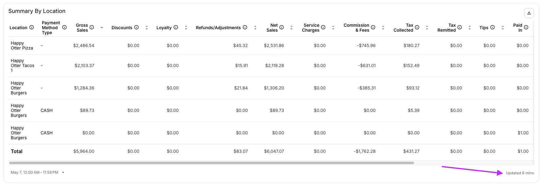 Le Résumé des Ventes montre les données de transaction quotidiennes sur tous les canaux. Bien que ce rapport affiche par défaut les données pour « Aujourd'hui », il peut être filtré pour afficher également des données historiques. Vous pourrez voir les données par canal, jour, emplacement et marque. Ce rapport peut être utilisé par les gestionnaires ou les comptables pour effectuer la réconciliation quotidienne des ventes, car il contient des données basées sur les dépôts en espèces traités et les paiements.