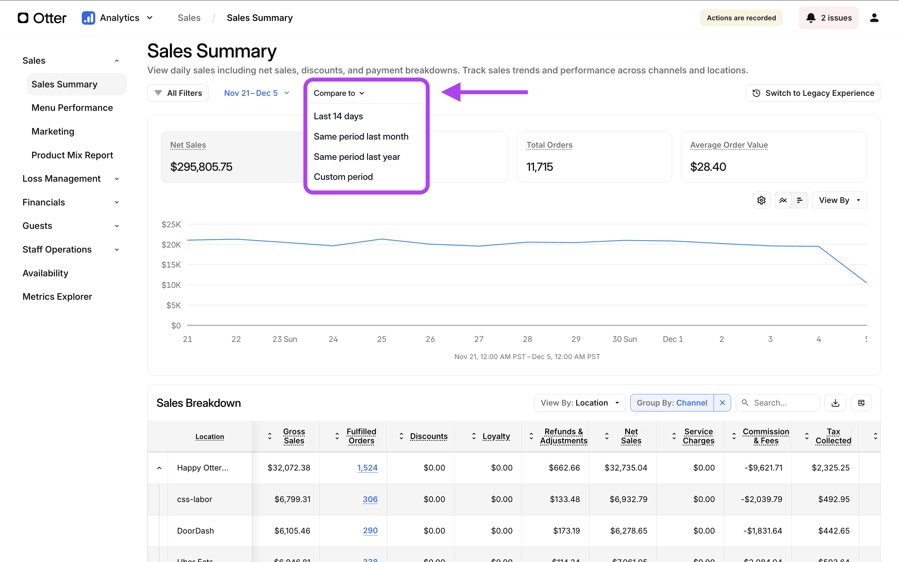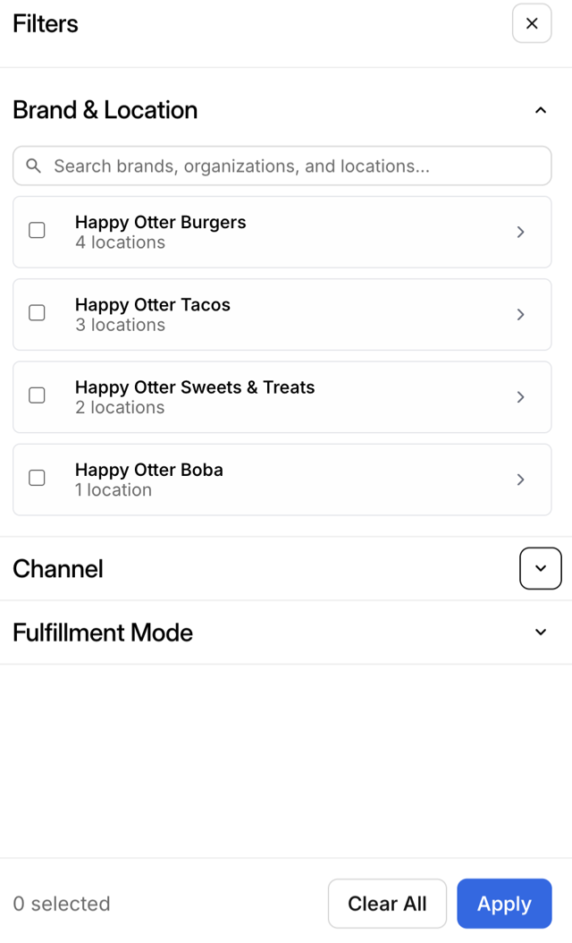 • Retards de données : Les données des partenaires de livraison peuvent prendre 24 à 36 heures pour se mettre à jour dans le tableau de bord Otter en raison des règlements ou ajustements effectués par le service de livraison ou le client. En raison de ce retard, le résumé des ventes ne doit pas être comparé aux ventes quotidiennes en direct.