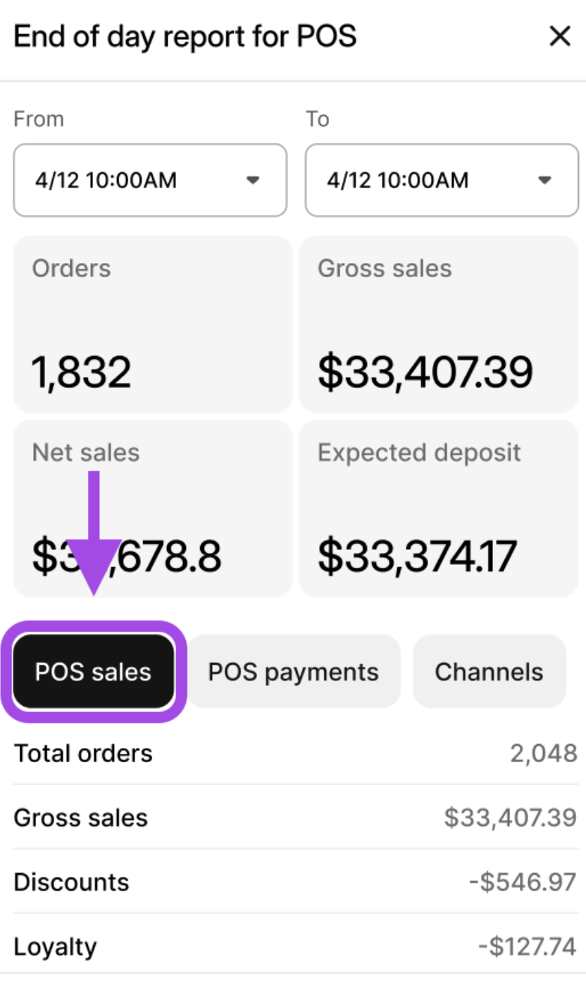 | 3 | Après avoir cliqué sur un emplacement spécifique depuis la page Accueil, un rapport de résumé des ventes est généré basé sur les données de commande en direct, excluant les données des emplacements non sélectionnés. | |