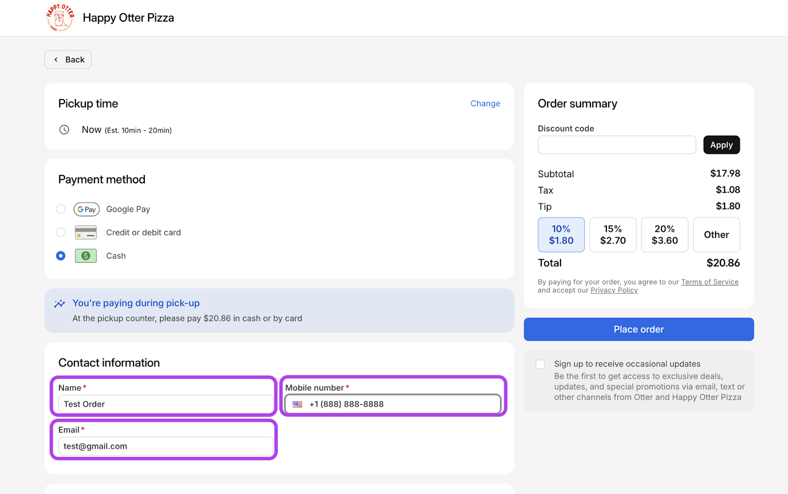 Si vous utilisez le produit Otter Direct Orders, vous devrez peut-être passer une commande de test pour vous assurer que votre intégration Direct Orders fonctionne correctement. Les commandes de test Direct Orders peuvent être passées via le site de commande en ligne de votre restaurant en passant une commande réelle en utilisant une carte de crédit comme paiement et en remboursant le montant immédiatement après.