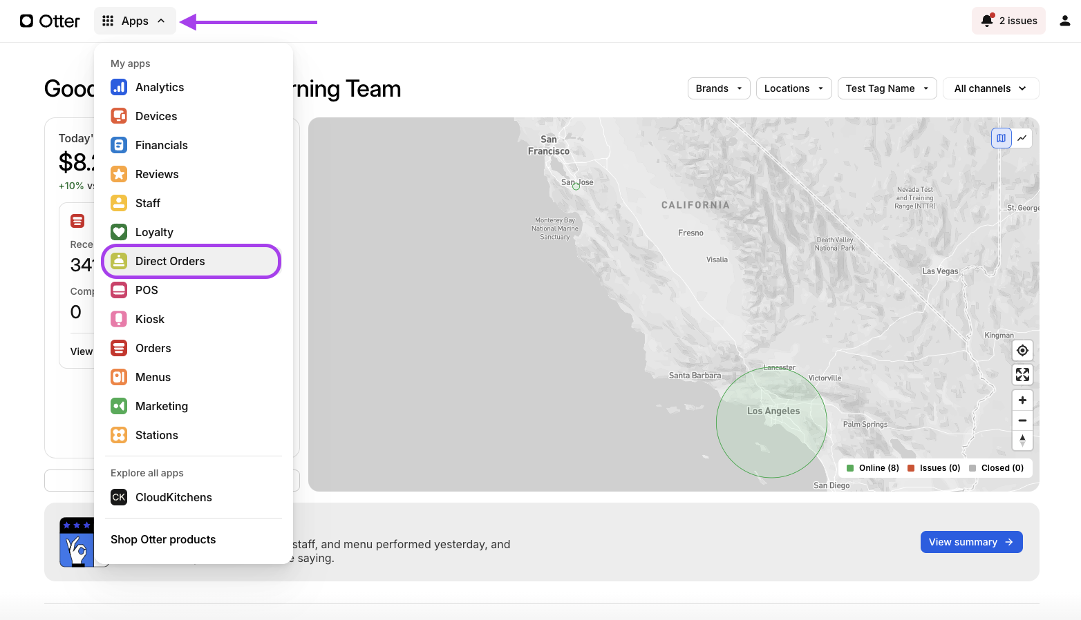 Accédez au Tableau de bord Otter. Cliquez sur [Applications] et sélectionnez [Direct Orders] dans la liste déroulante. |