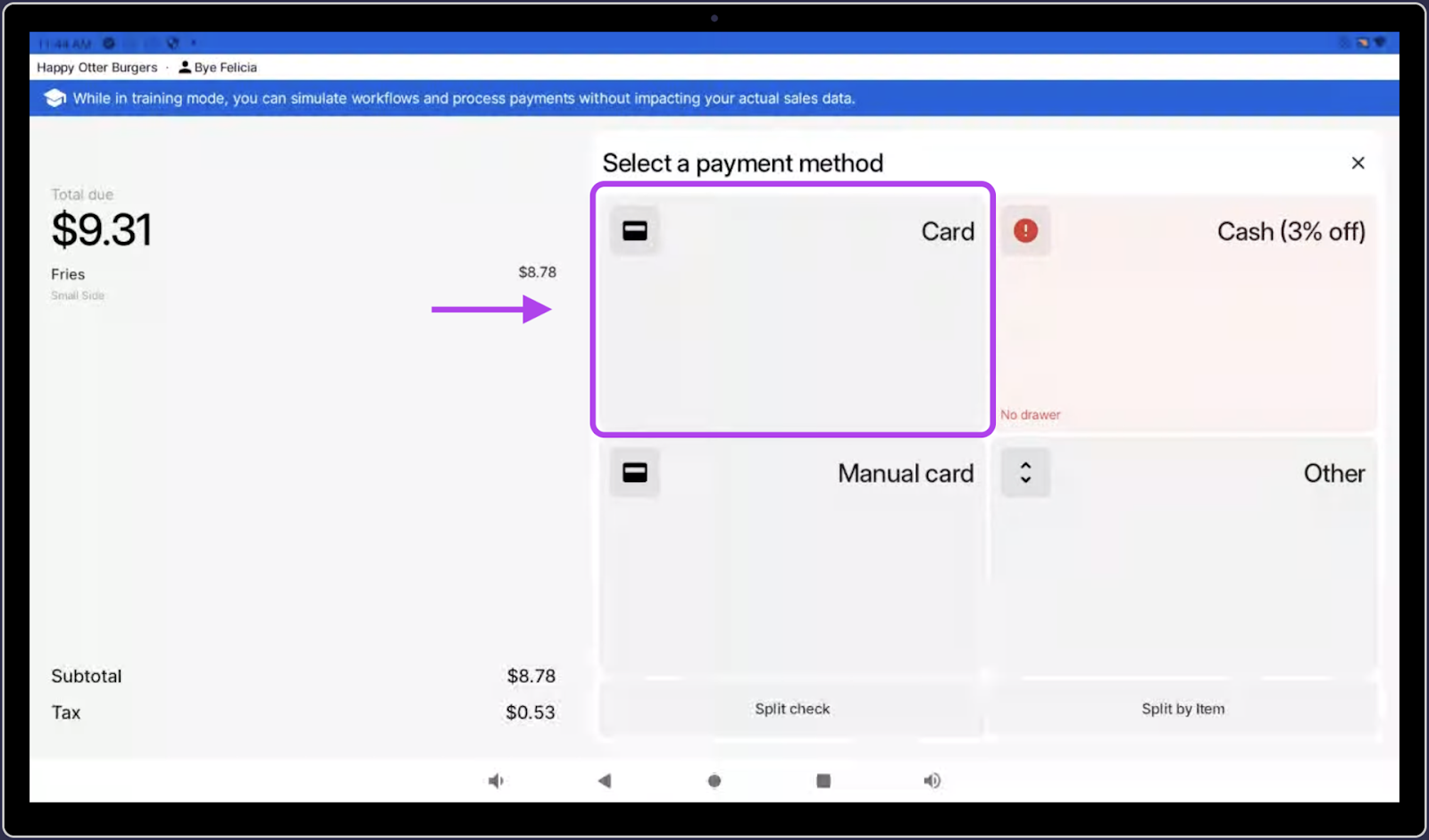 Les tests peuvent inclure la gestion des commandes POS, la pratique de l'application d'une remise, l'annulation d'articles, l'envoi d'articles à la cuisine, l'impression de reçus et la réalisation de paiements fictifs via le lecteur de carte en "mode formateur" sans affecter les données réelles. -