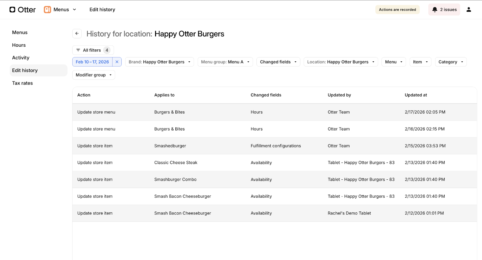 Accédez au tableau de bord Otter. Ouvrez l’application Menus. Cliquez sur l’onglet Historique des modifications du menu. |