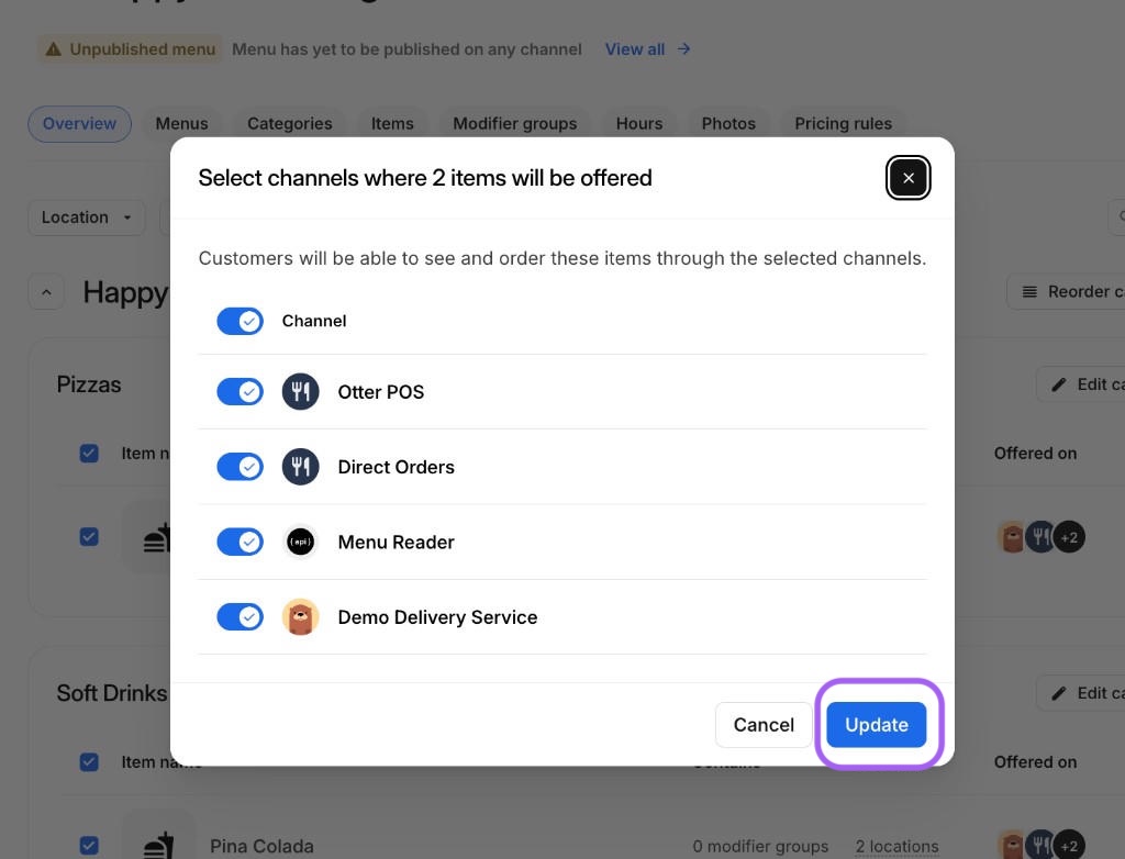 Maintenir l’exactitude de votre menu sur chaque canal de commande est essentiel pour éviter toute confusion, commande incorrecte ou remboursement inutile. Bien que la fonction 86 pour un article soit utile pour marquer temporairement un produit comme indisponible, la disponibilité par canal est conçue pour un contrôle à long terme sur l’affichage des articles sur différents canaux.
