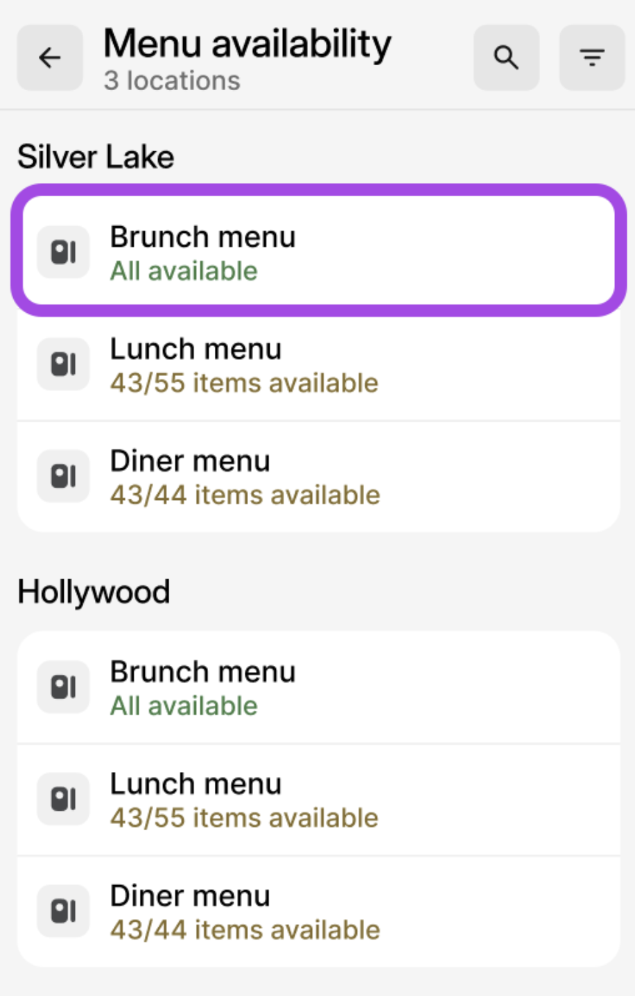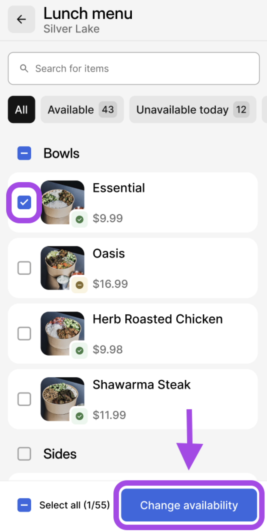 Maintenir votre menu à jour avec la disponibilité des articles pour informer vos clients de ce qui est actuellement commandable est crucial pour le bon fonctionnement de l'entreprise— s'assurer qu'il n'y a pas de confusion en cuisine ou de remboursements nécessaires pour des articles en rupture de stock commandés par des clients sur des plateformes où les articles correspondants n'ont pas été 86’d (marqués indisponibles).