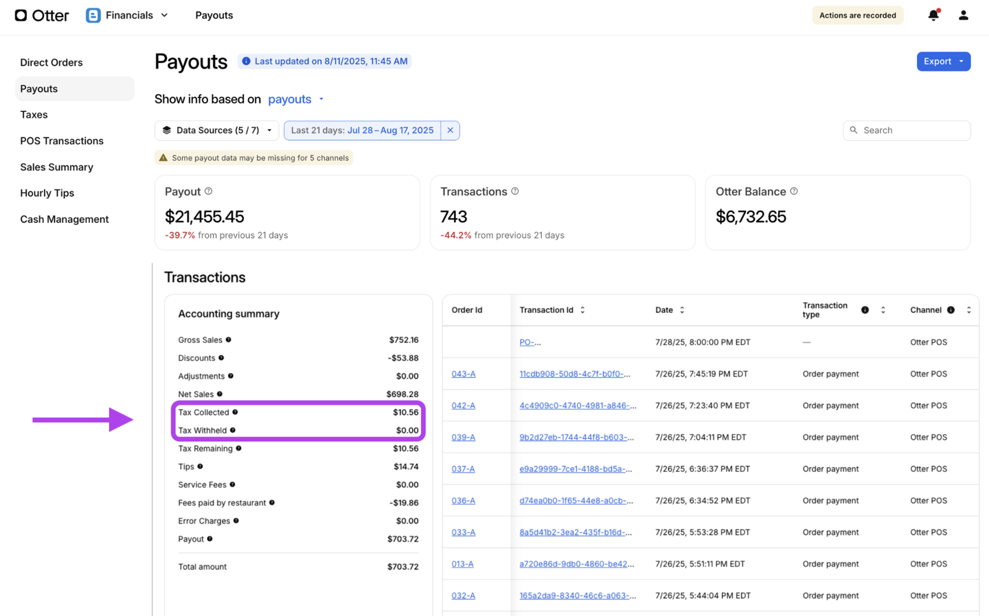 Vous devez utiliser le rapport Résumé des ventes dans la page Finances pour consulter les taxes des ventes de première partie. Les ventes de première partie incluent les données de Otter POS, Kiosk, et Commandes Directes en Ligne.