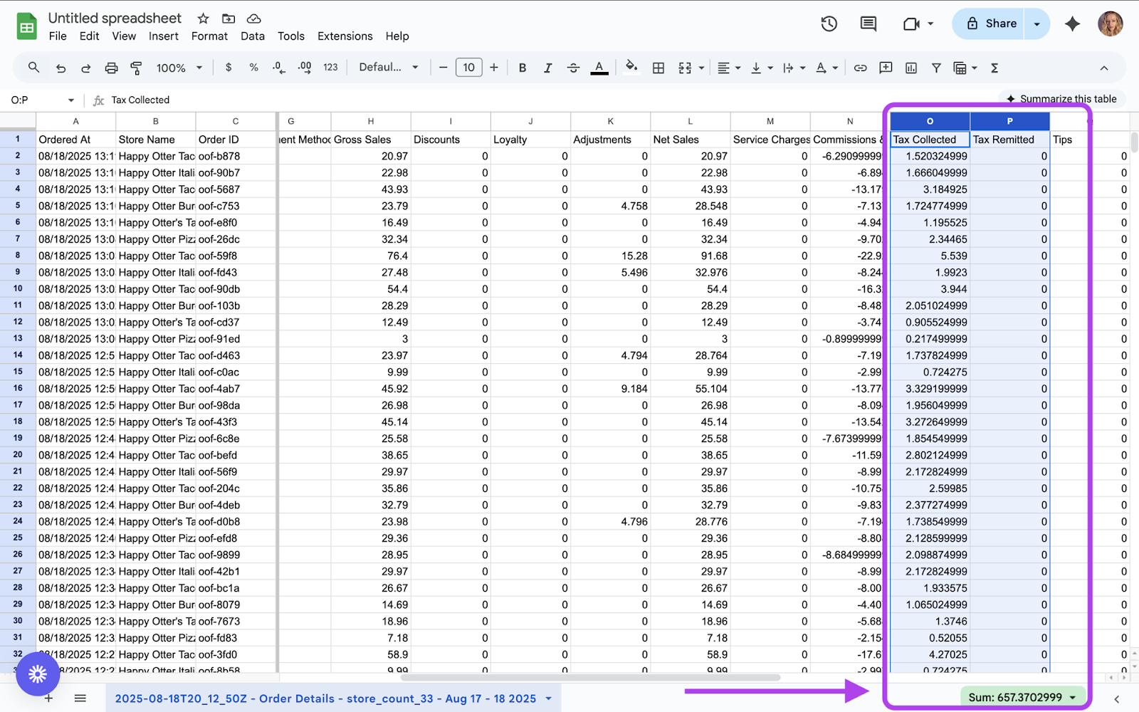 Utilisez le Résumé des ventes pour consulter les données fiscales des commandes de première partie, y compris Otter POS, Kiosk, et Commandes Directes en Ligne.